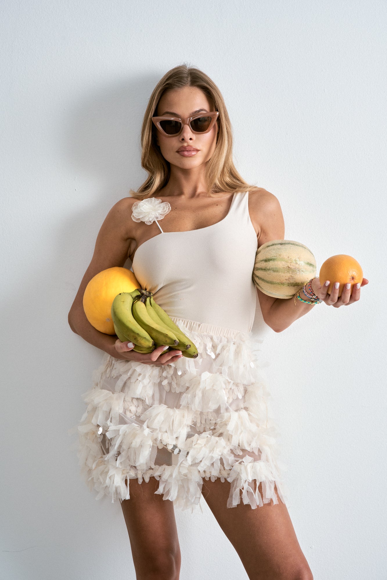 Coordinato due pezzi composto da body in jersey e minigonna con pantaloncino interno. Un look delicato e sorprendente, pensato per chi ama sentirsi libera, elegante e sicura di sé.