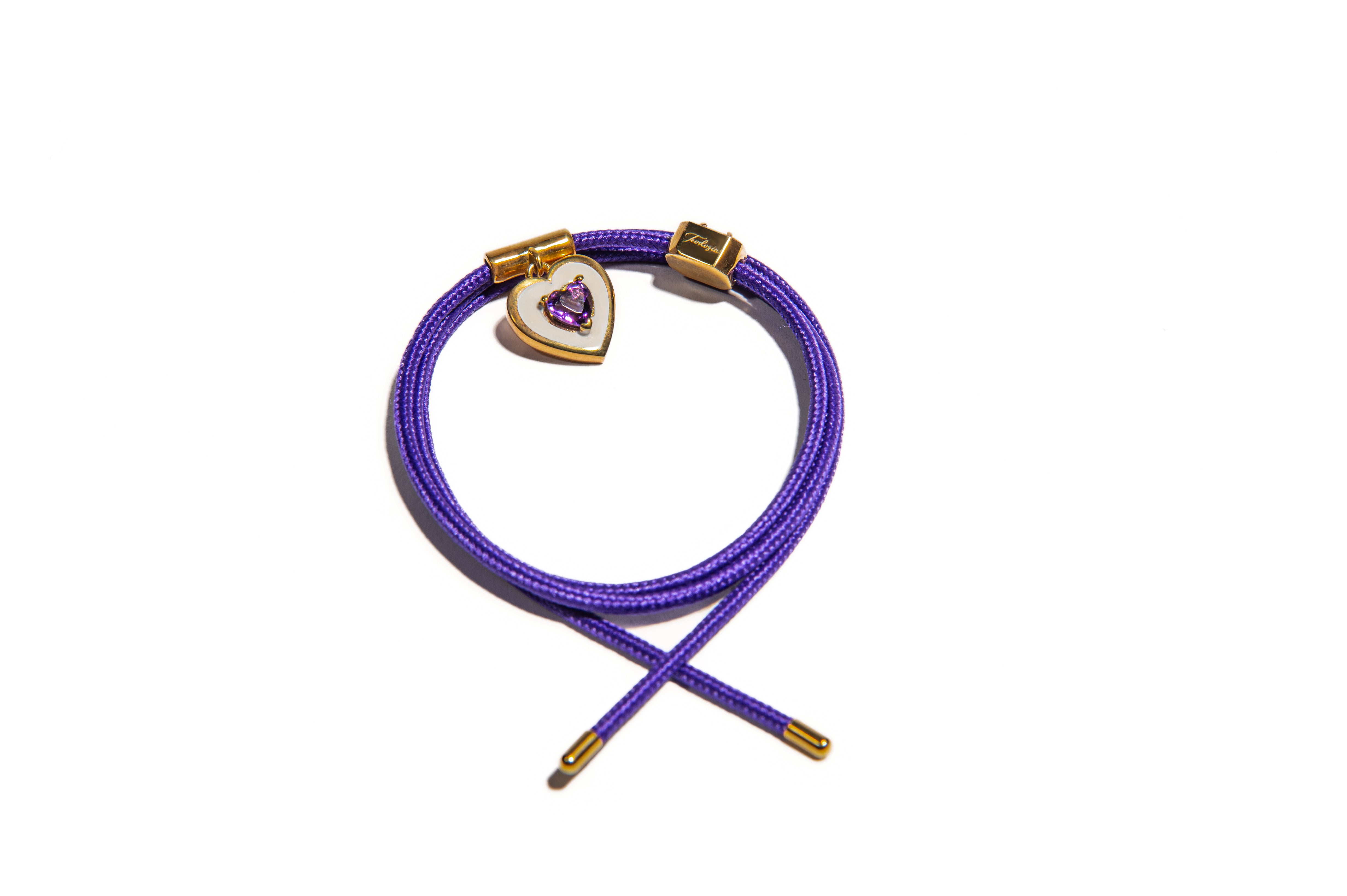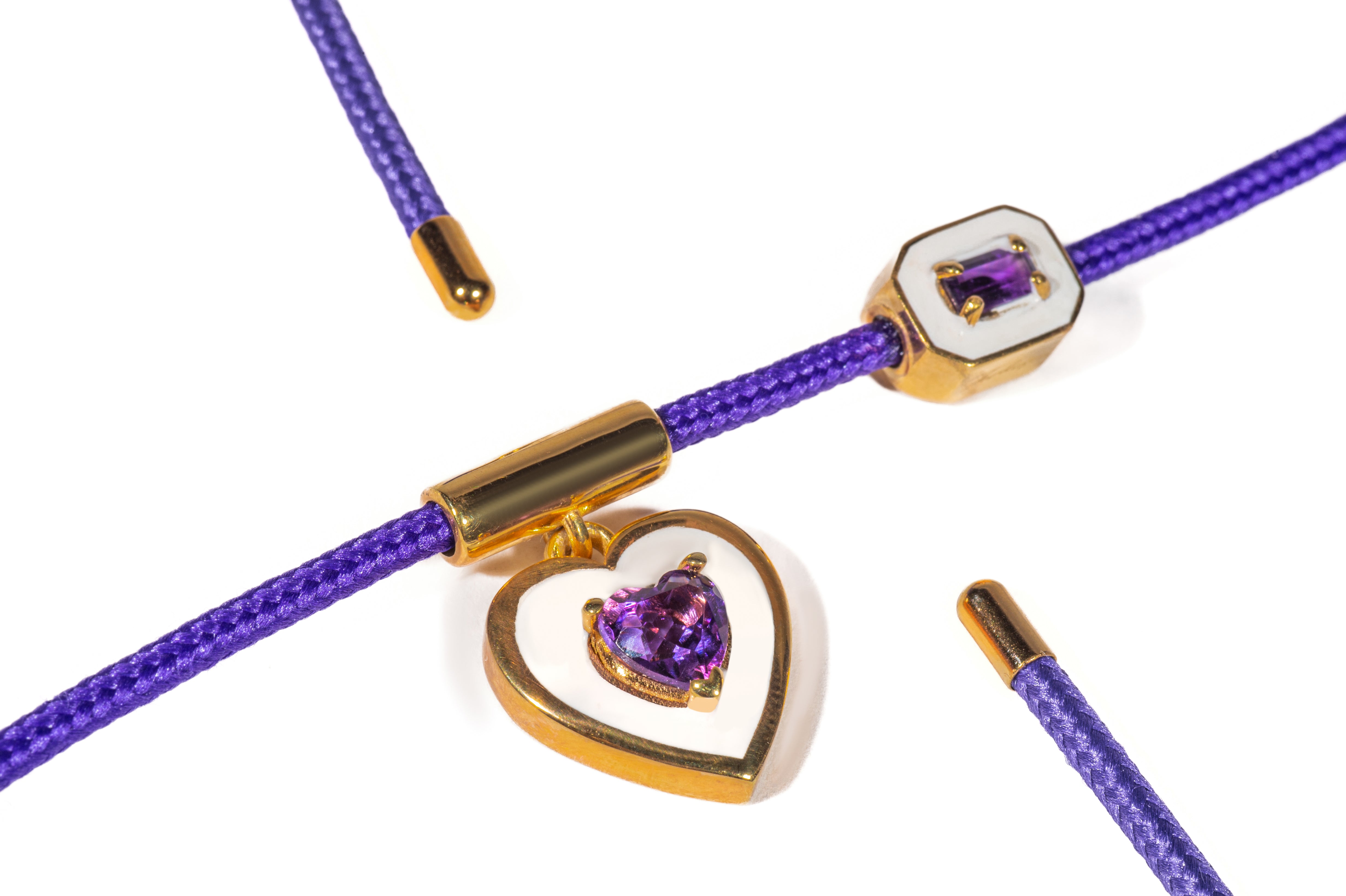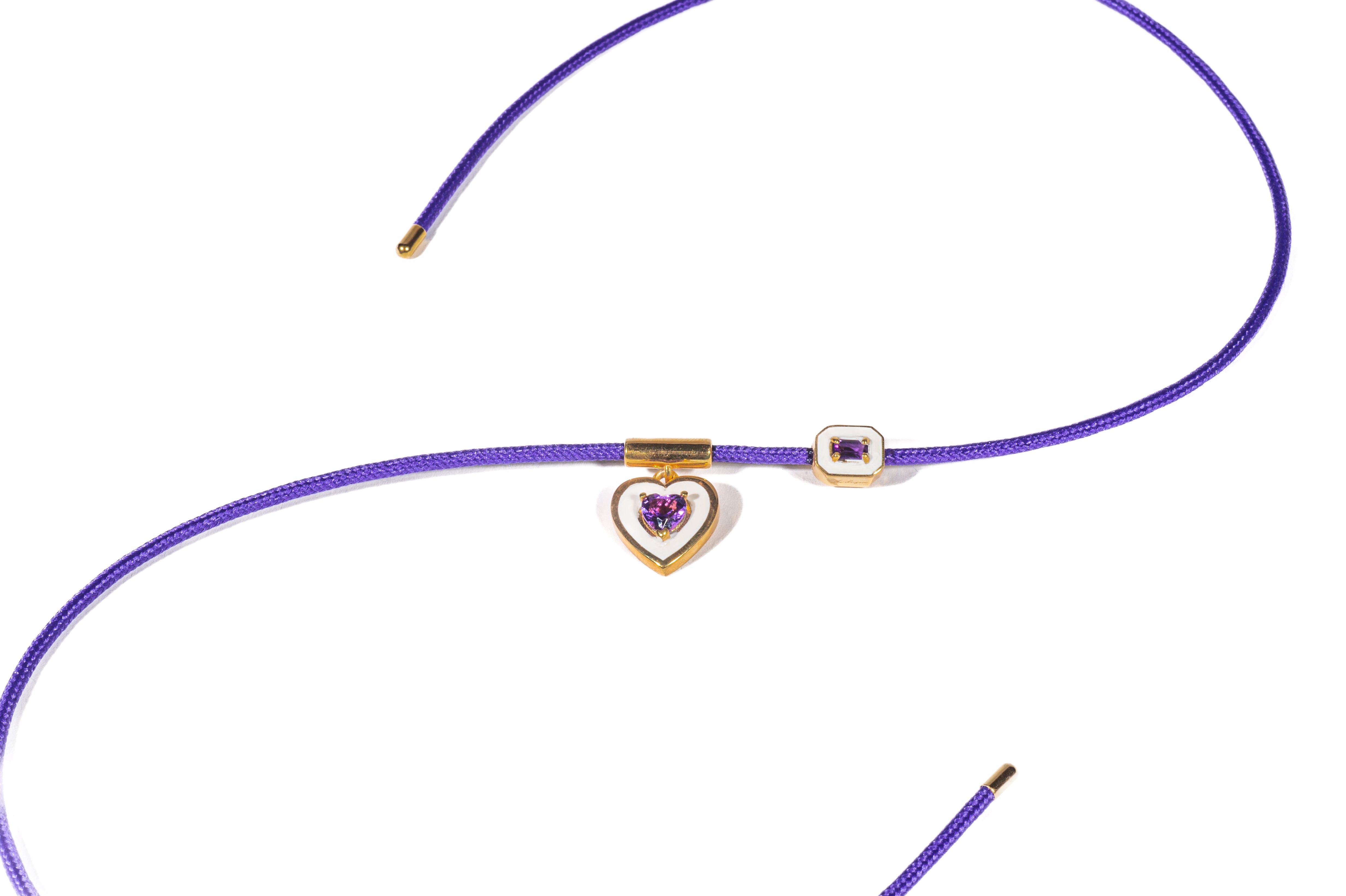 Il suo cordino magnetico si avvolge con naturalezza, creando un effetto elegante e fluido, mentre i charms fissi in forma di cuore e di gemma geometrica donano un tocco luminoso e romantico.