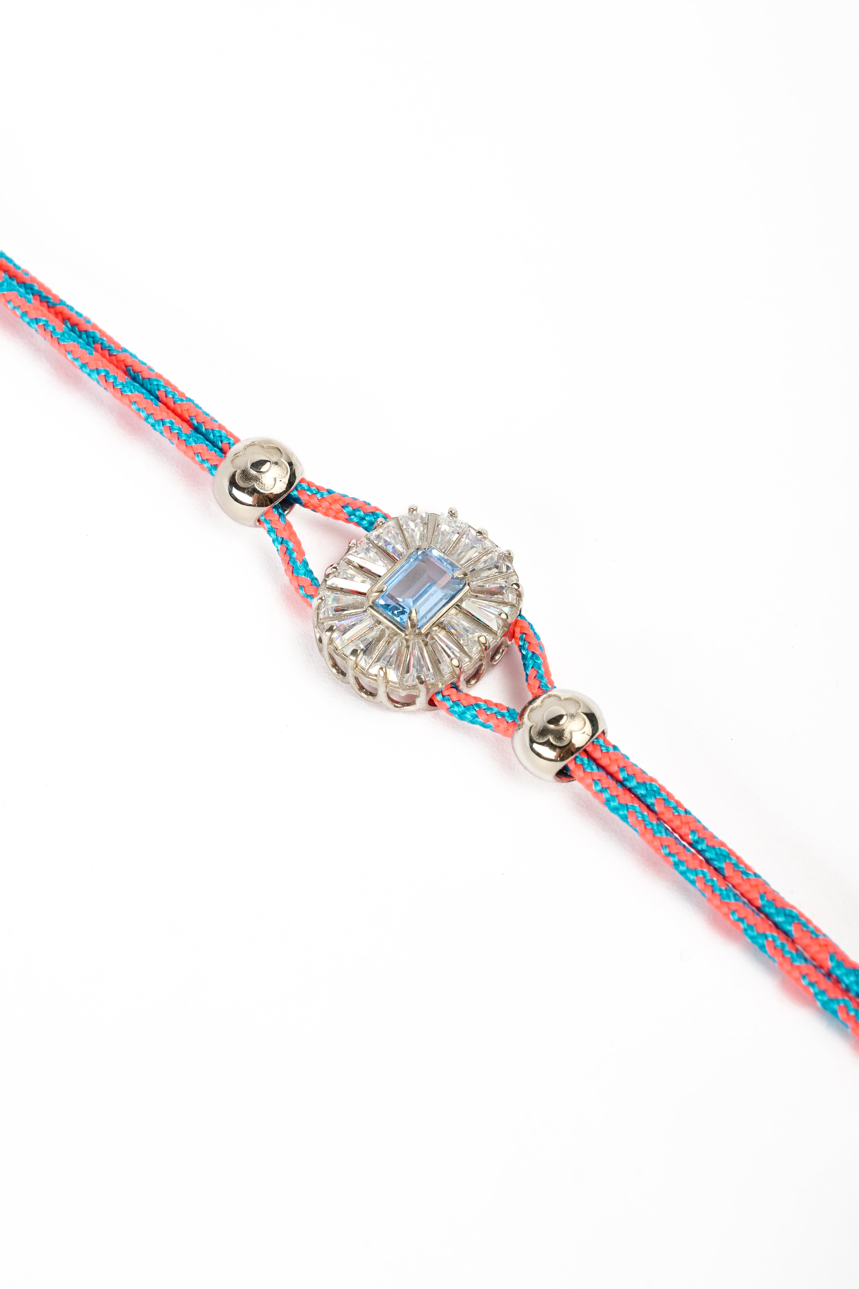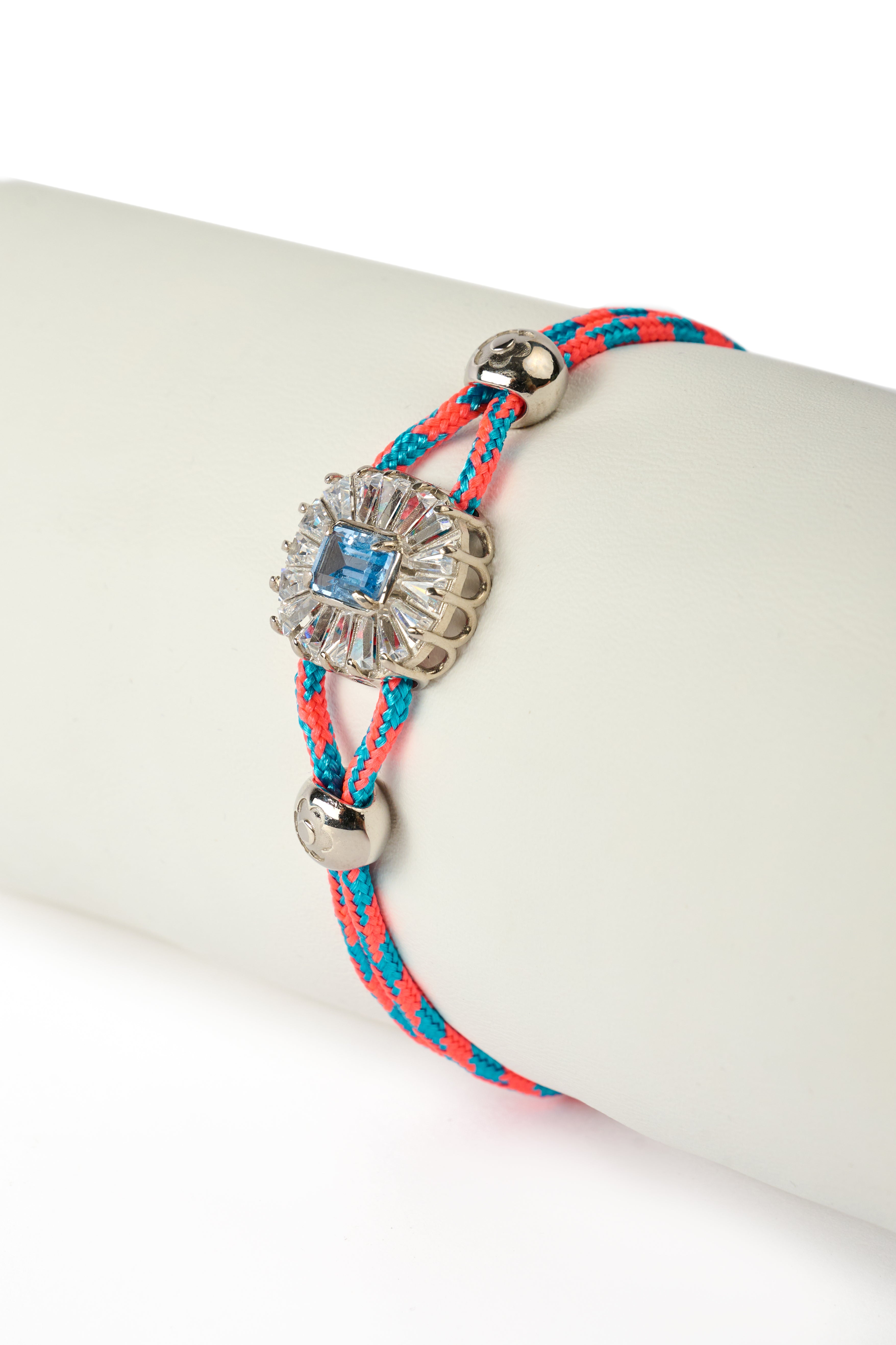 Realizzato a mano in Italia, Iris Ghiaccio unisce la vivacità della corda arancio e azzurra a una pietra centrale con taglio smeraldo, in tonalità azzurra , incastonata in una montatura in argento 925 con zirconi baguette radiali.