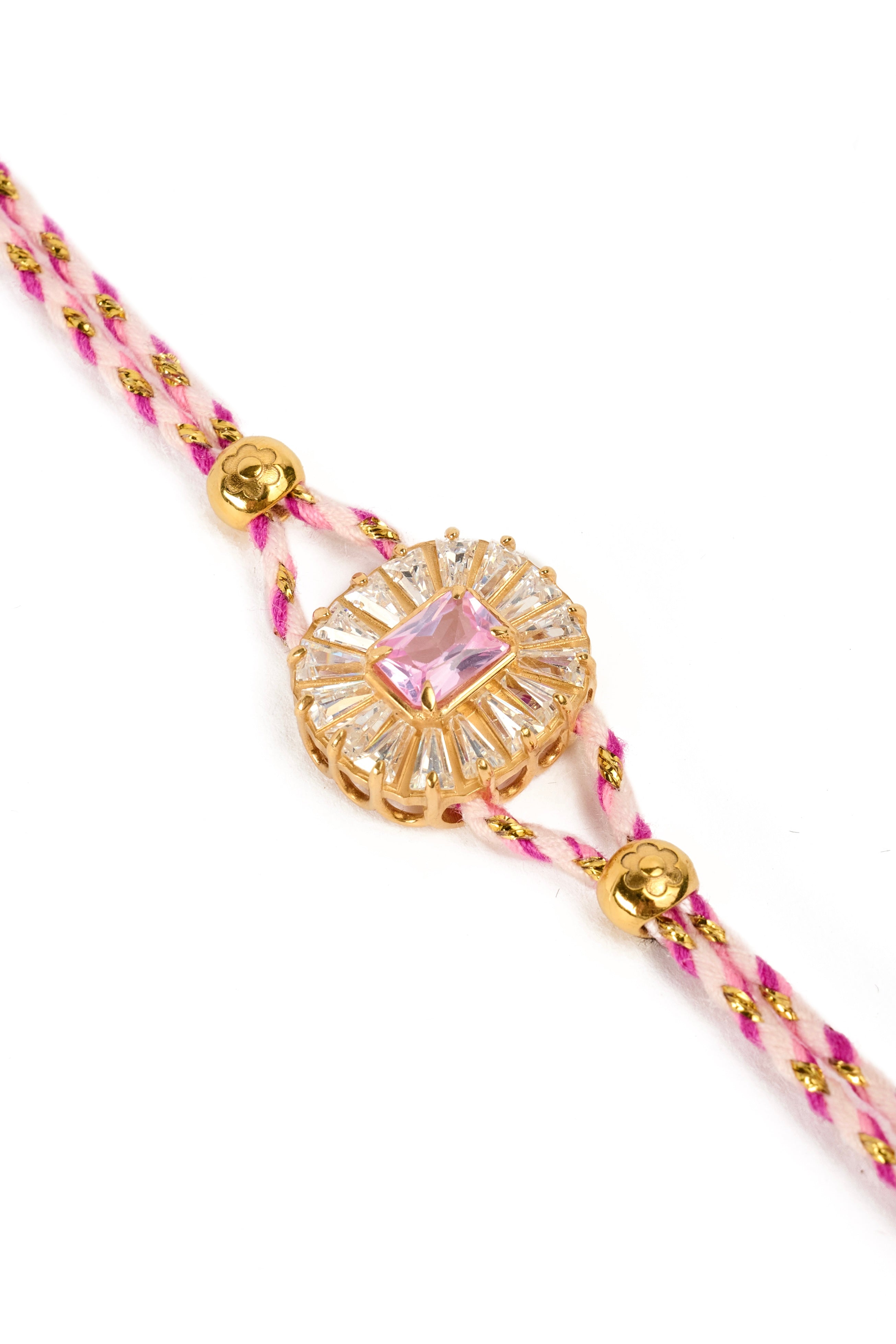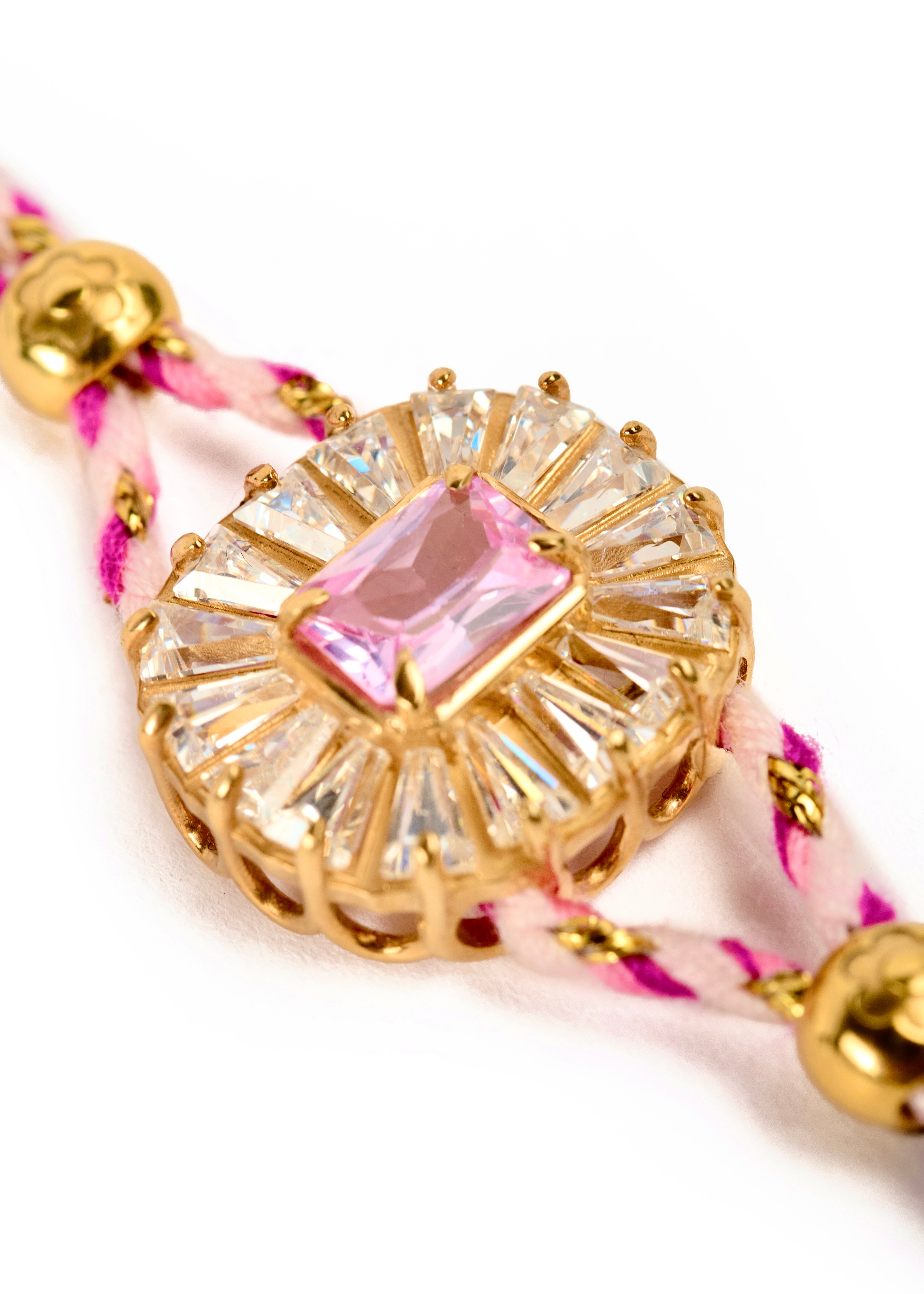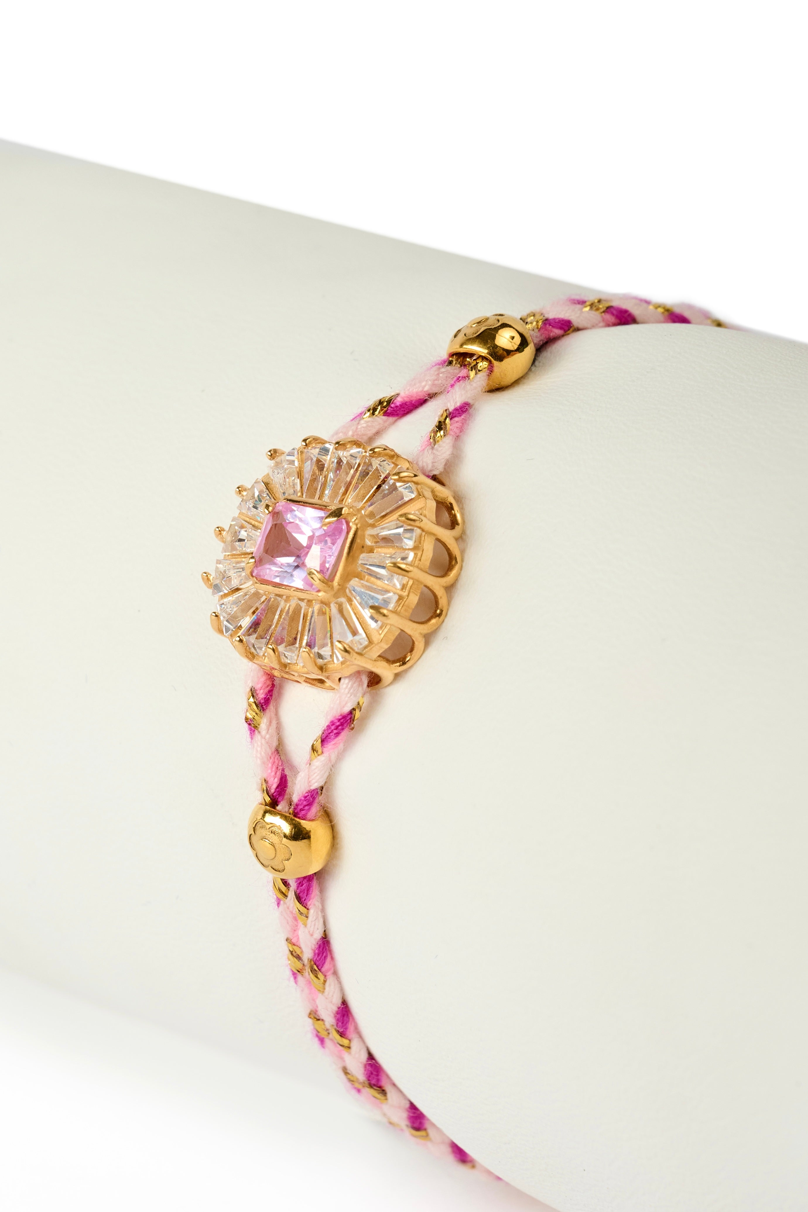 Iris Rosa unisce l’energia della corda intrecciata in 2 tonalità di rosa con un filo lamè oro, alla brillantezza di una pietra sintetica taglio smeraldo, incastonata in una montatura dorata in argento 925, impreziosita da zirconi in baguette radiali.