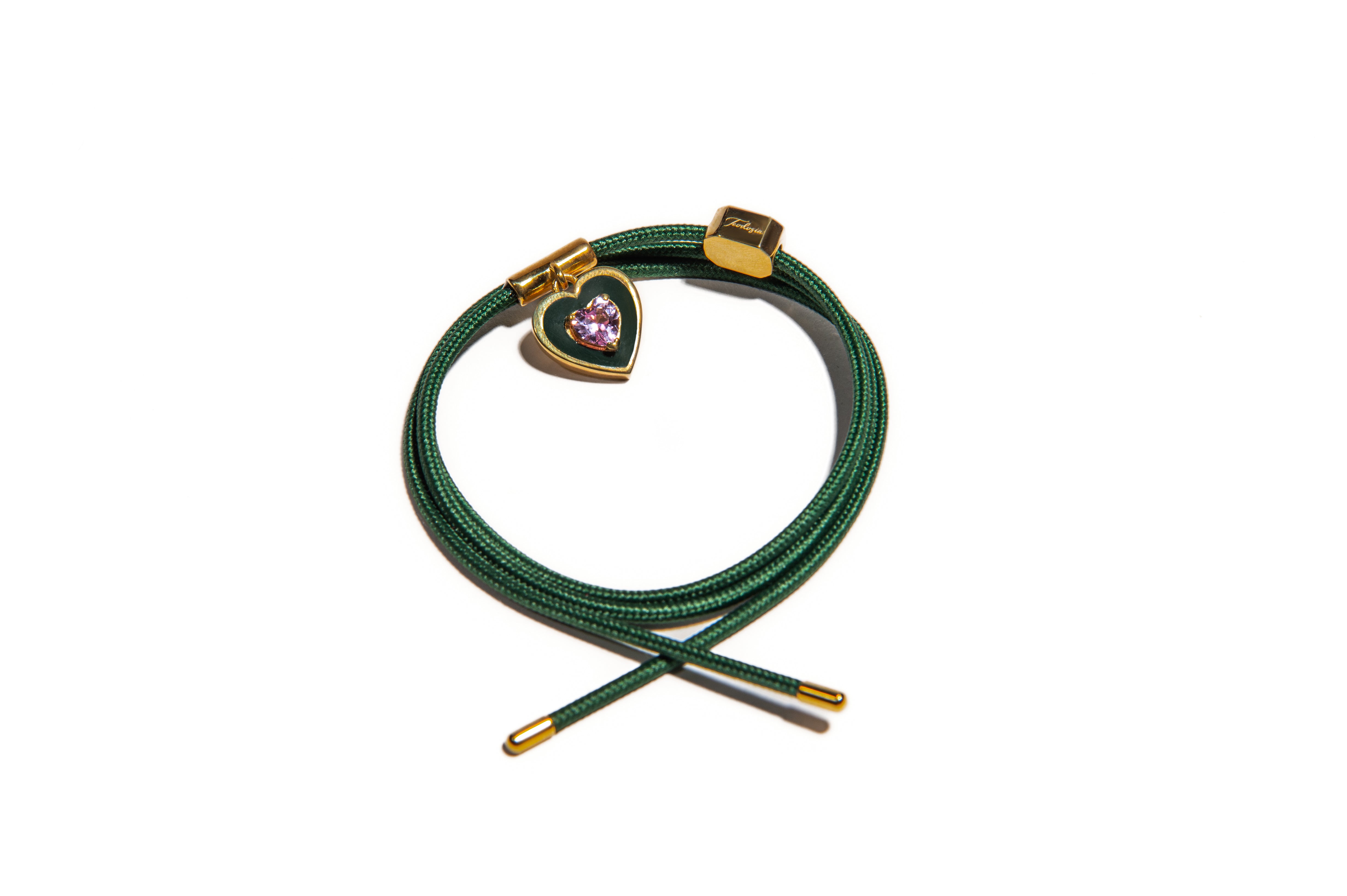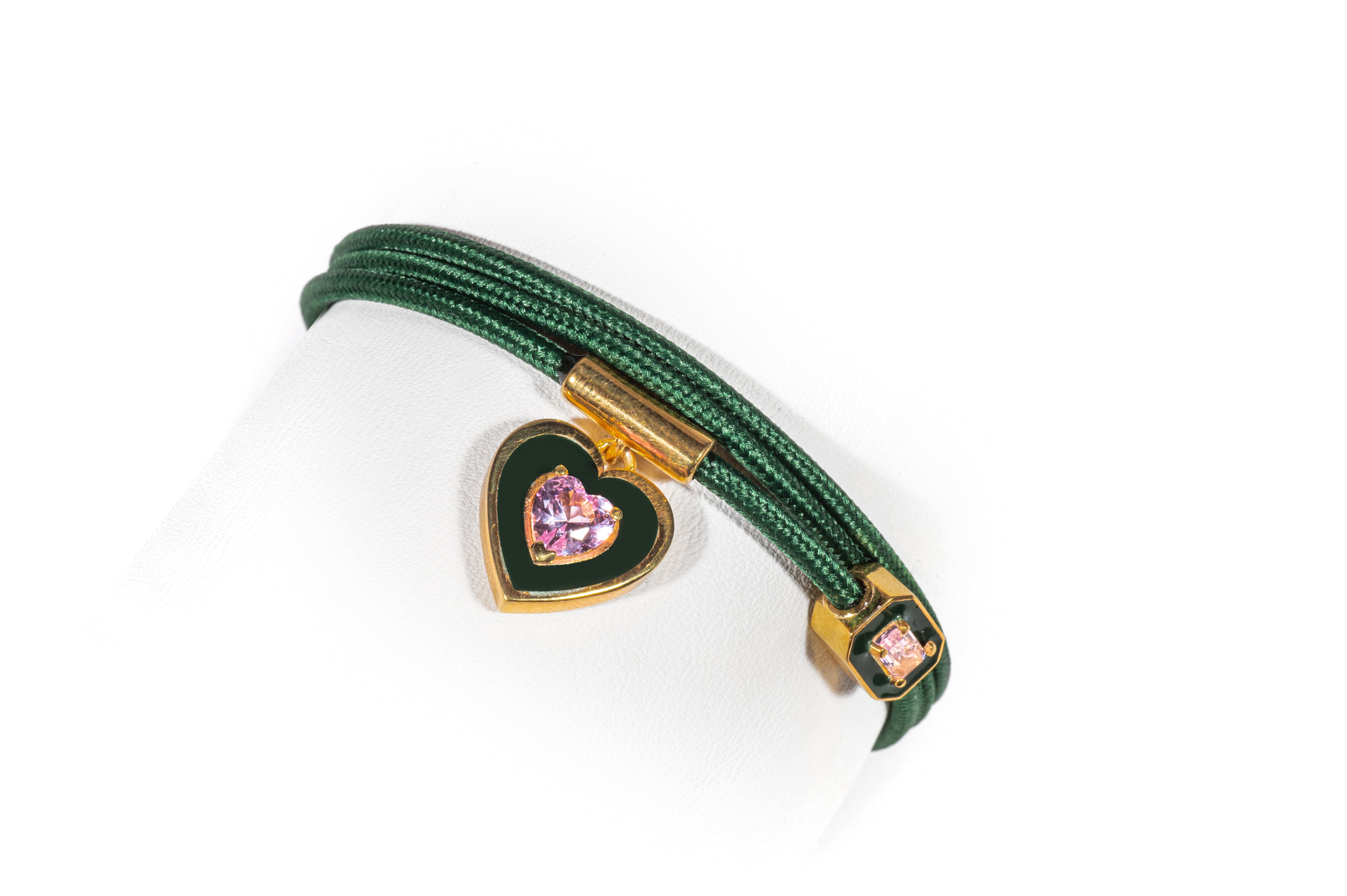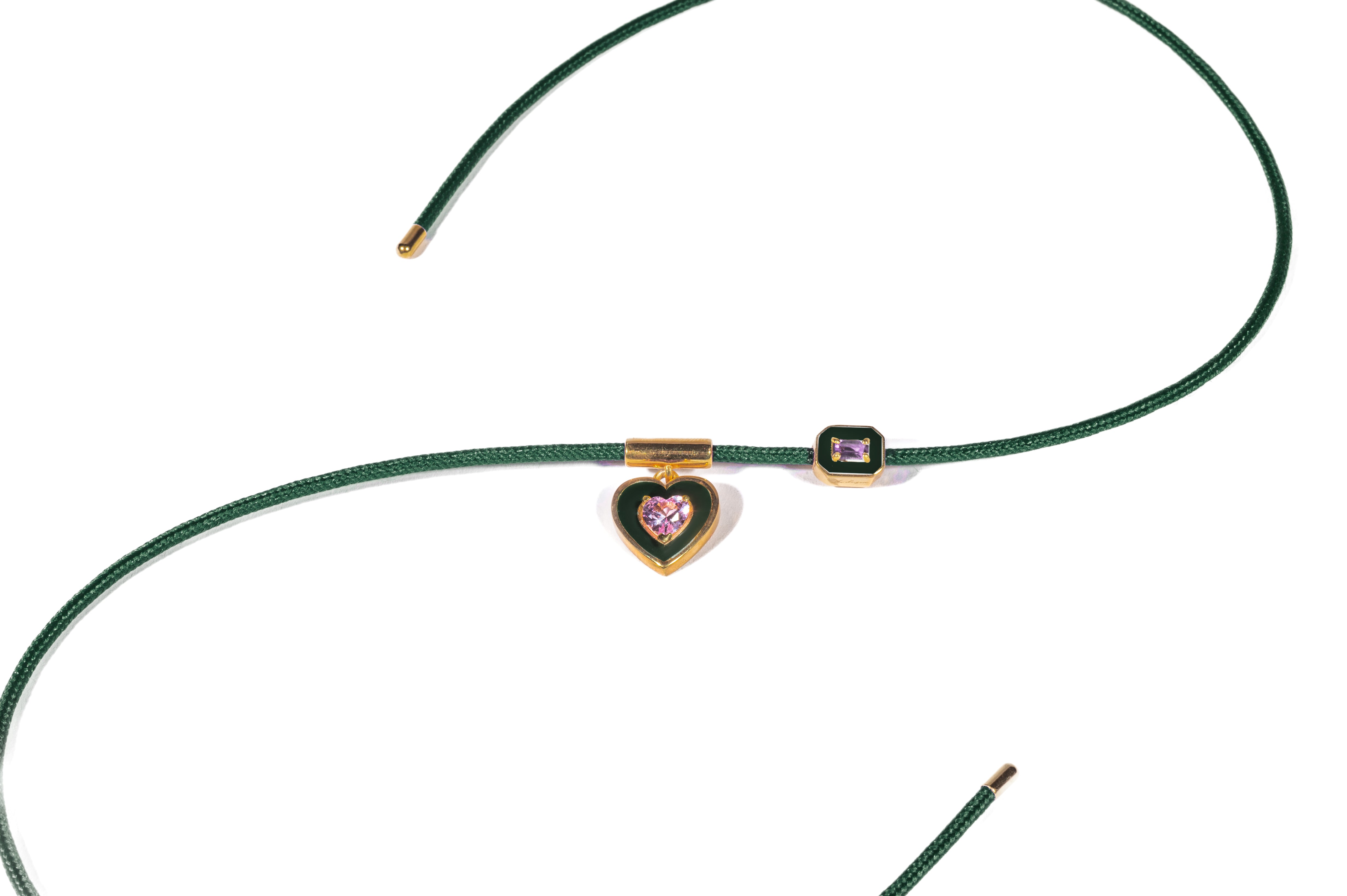 Il suo cordino magnetico si avvolge con naturalezza, creando un effetto elegante e fluido, mentre i charms fissi in forma di cuore e di gemma geometrica donano un tocco luminoso e romantico.